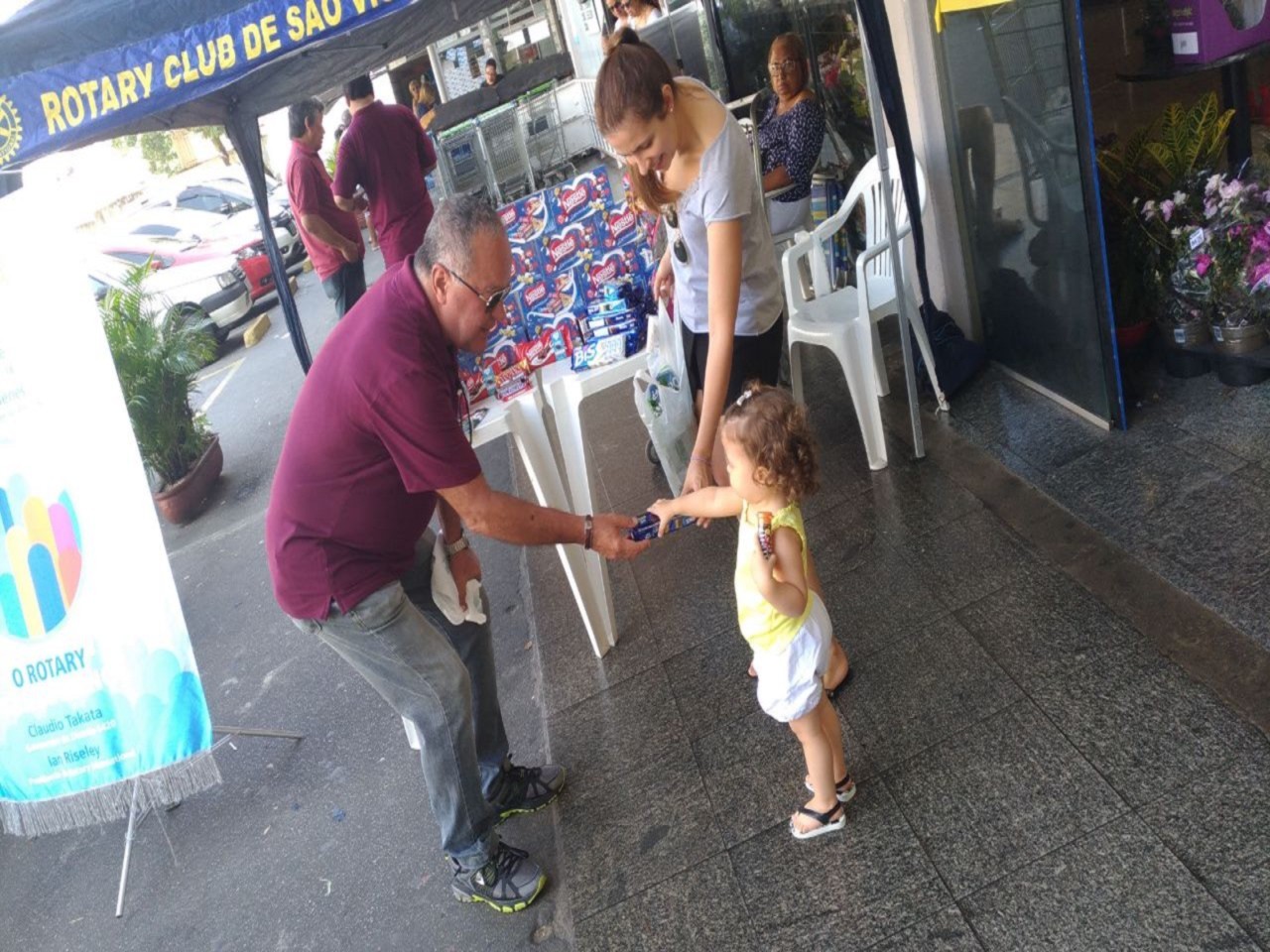 Em dia de muiiiiito trabalho realizamos a Páscoa Solidária no Supermercado Pão de Açucar em São Vicente com a presença eficaz dos companheiros Toshio, Meire. Wagner,João, Carmem, Silva, Edson, Roberto, Tatiana, Kleber,Henry e Douglas e a esposa do presidente André, Daniela além das presenças das amigas de nosso clube Teresa Cristina Tavares, Rosinha, Alessandra Arroyo, Juliana, Rosana. A colaboração dos companheiros do RC de SVicente Praia capitaneados pelo casal presidente 2018-19 Leandro e Susy e sua filha tb foi essencial para nosso trabalho. Ao pessoal da Creche Vovó Alaide um obrigado por sua presença e trabalho. A receptividade dos funcionários da loja foi sensacional e facilitaram em muito todo a nossa atividade. Obrigado ao gerente Cristiano e sua equipe. Arrecadamos 66 kg de chocolates diversos e uma parte foi imediatamente entregue à Creche. SUCESSO DE TODOS! ESTAMOS TODOS FELIZES. É ROTARY TRABALHANDO PARA A COMUNIDADE CARENTE!