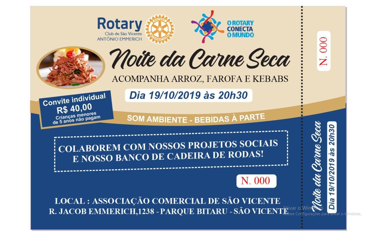 Noite da Carne Seca acontece dia 19 de oiutubro de 2019 tradicional evento que promovemos com o intuito de angariar fundos apara manter nossos projetos sociais e o Bnco de Cadeiras de Rodas na Associação Comercial de São Vicente rua Jacob Emerich 1238 a partira das 21hs:00 , crianças menores de 08 anos não pagam.